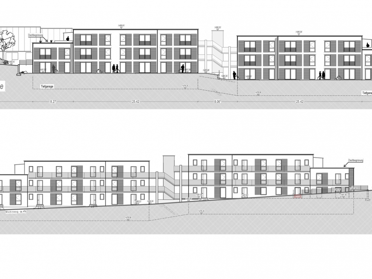 Die 22 WE auf dem leicht abfallenden Grundstück, clever und platzsparend angeordnet zugänglich über gleichermaßen praktische und moderne Außentreppen erfüllen das alles.