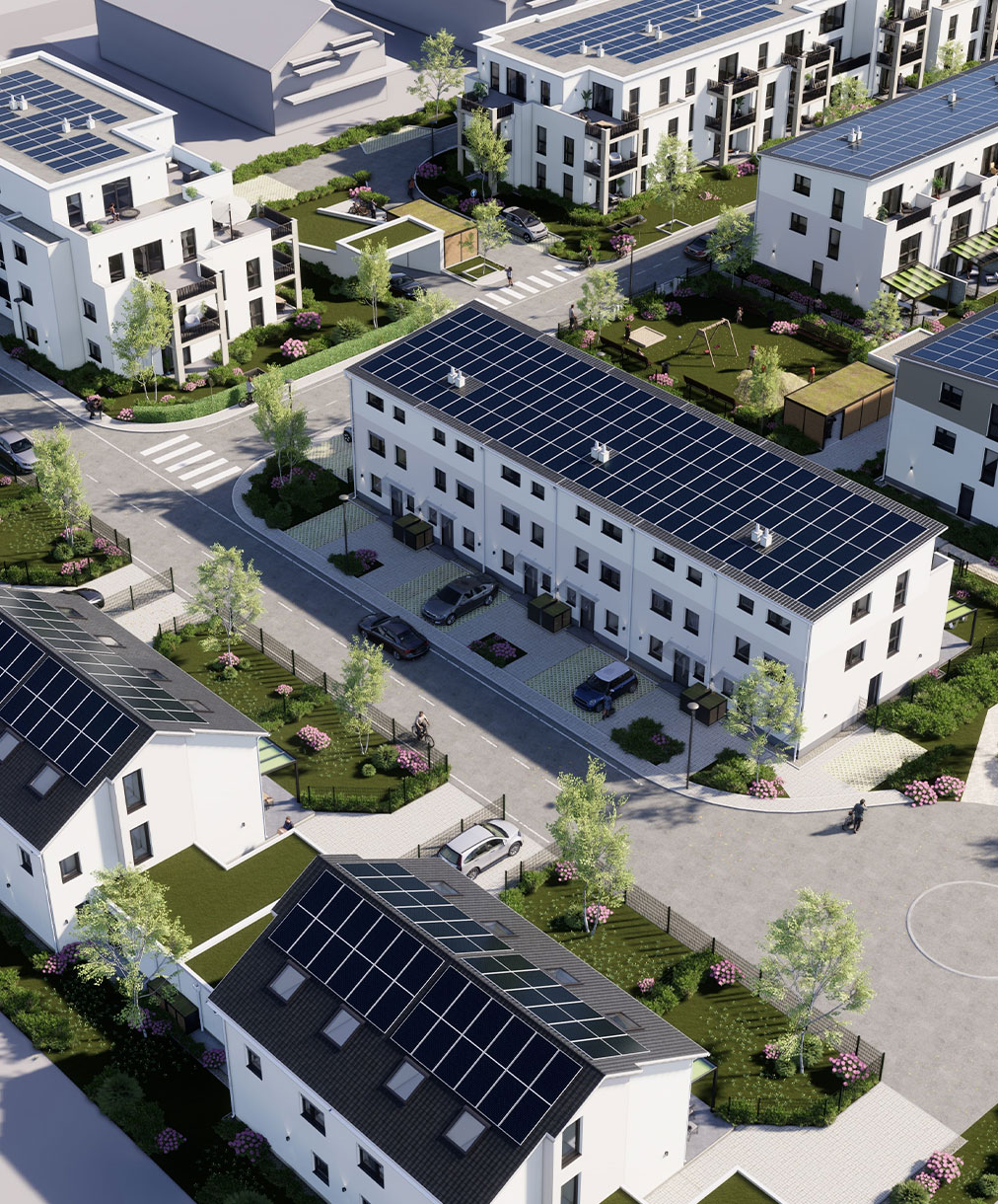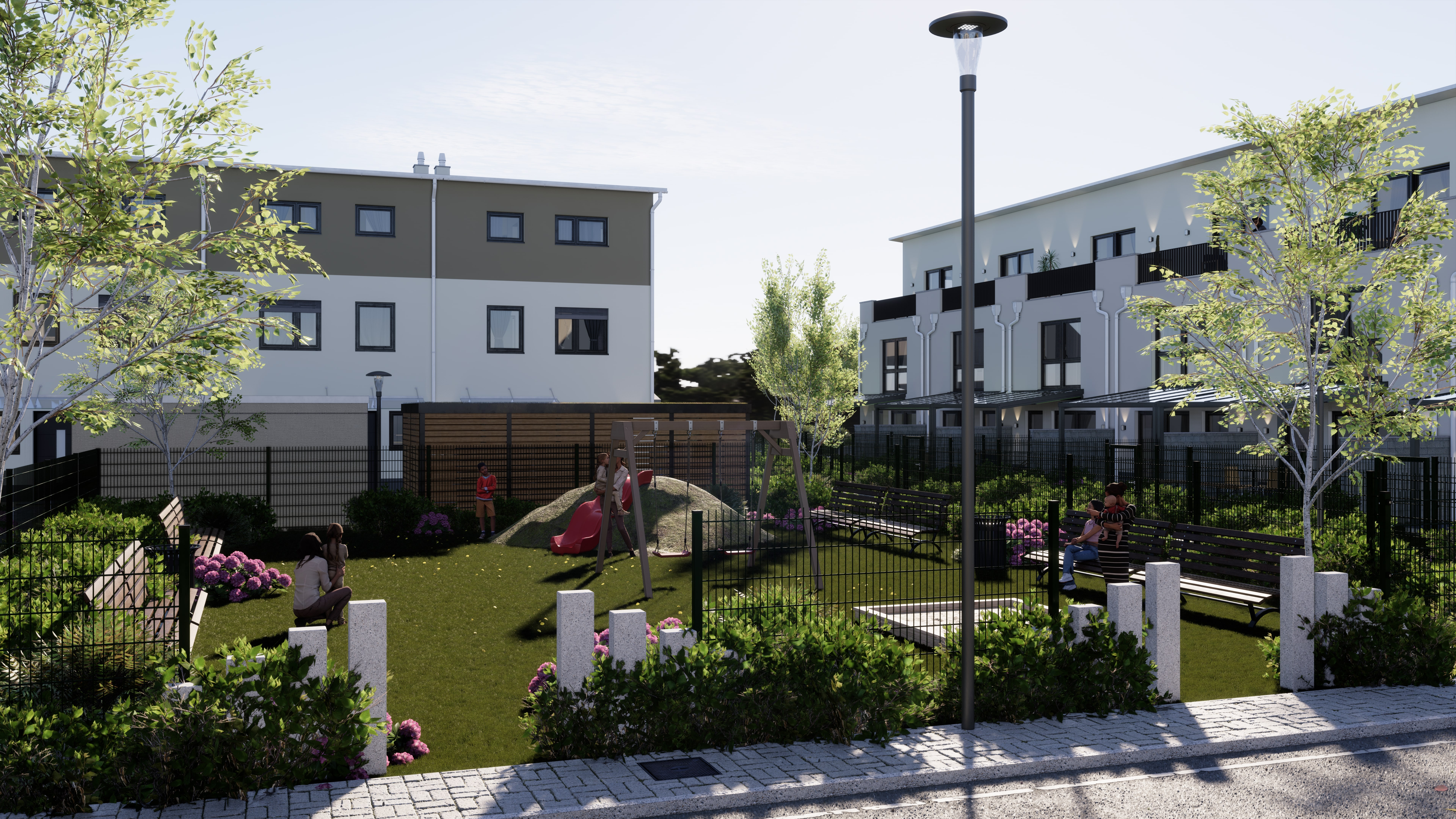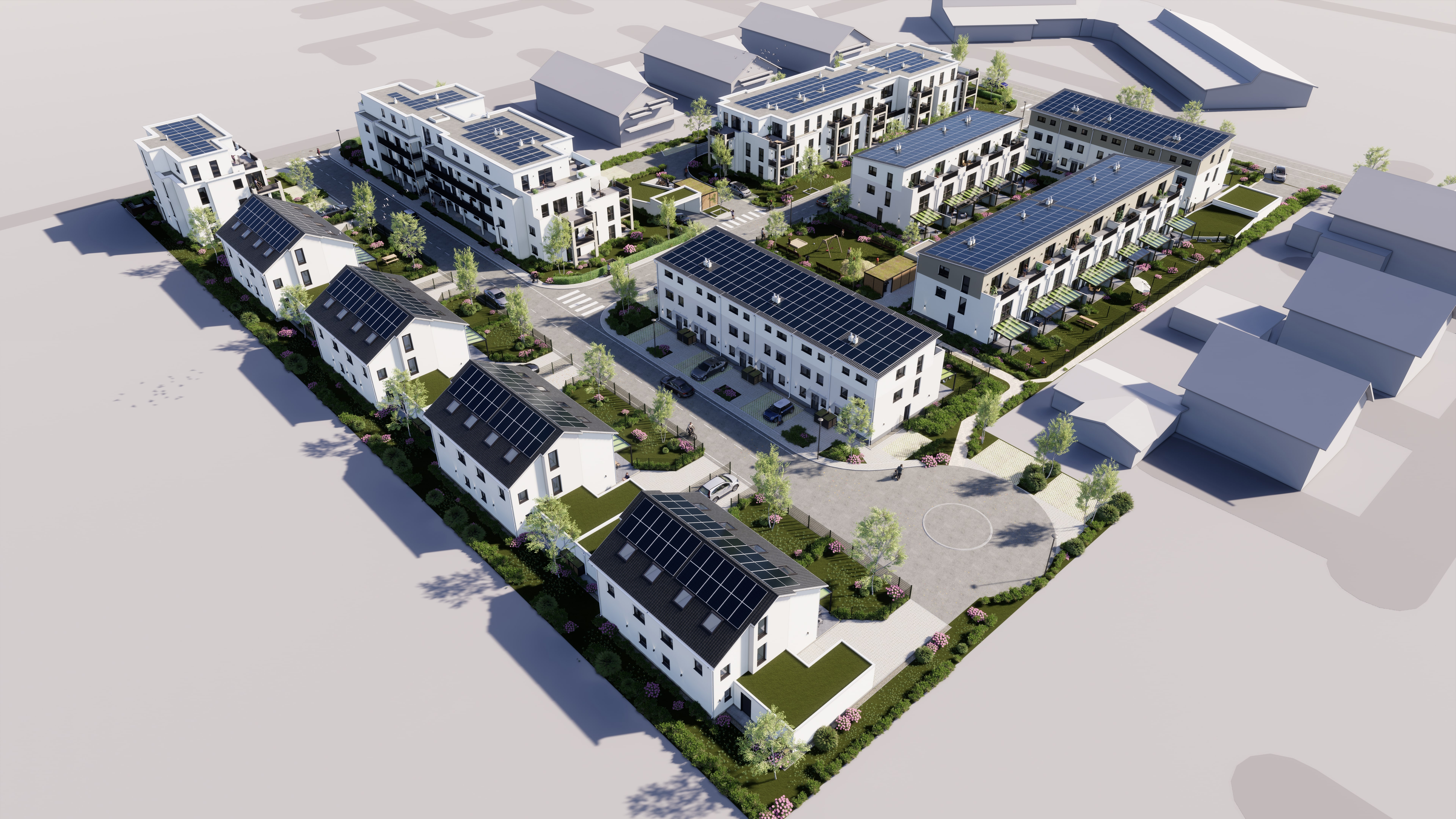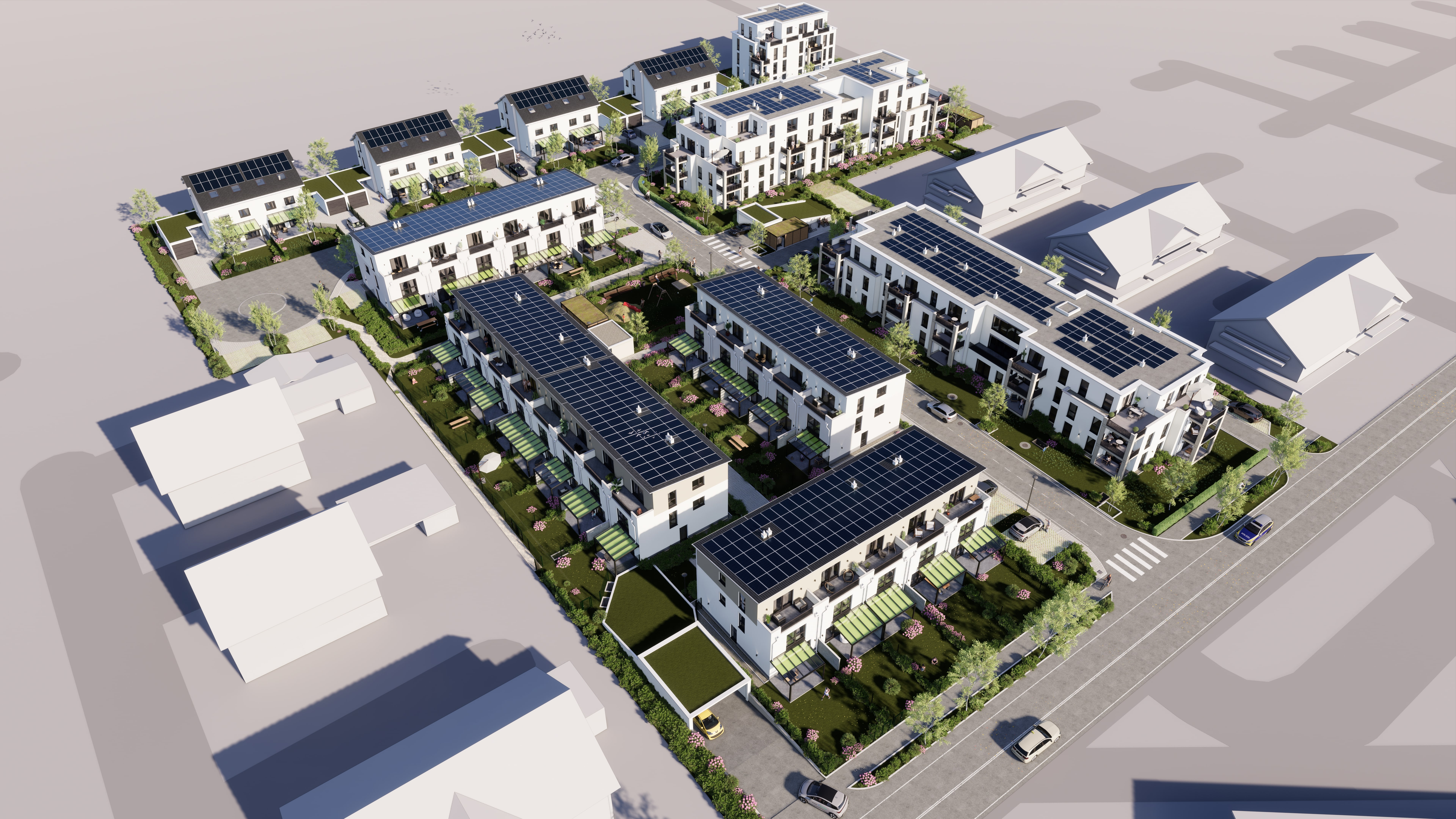 24 Reihenhäuser, 8 Doppelhaushälften und 3 Mehrfamilienhäuser mit insgesamt 86 Wohneinheiten.