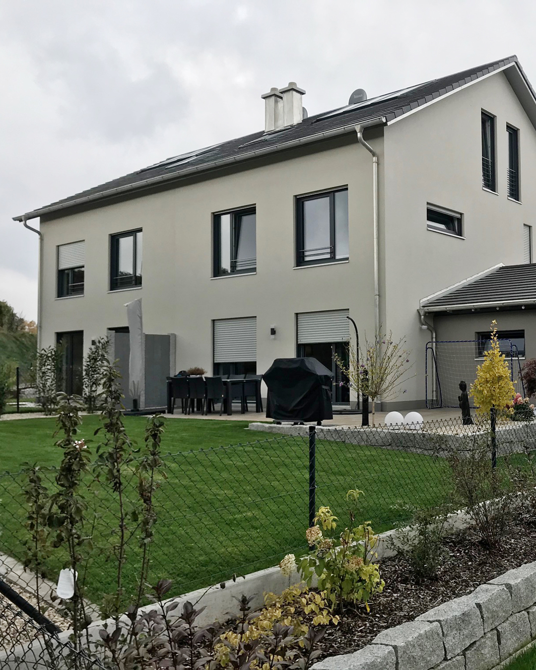Die fünf Reihenhäuser der Anlage sind perfekt auf die Bedürfnisse moderner Familien zugeschnitten. Jede Einheit verfügt über ein voll ausgebautes Dachstudio, das den Wohnkomfort deutlich steigert. Mobilität inklusive – Mit zwei Garagen und einem zusätzlichen Stellplatz pro Reihenhaus haben wir das Thema Parkraum progressiv gelöst – insgesamt zehn Fertigteilgaragen sorgen für eine stressfreie Parksituation.