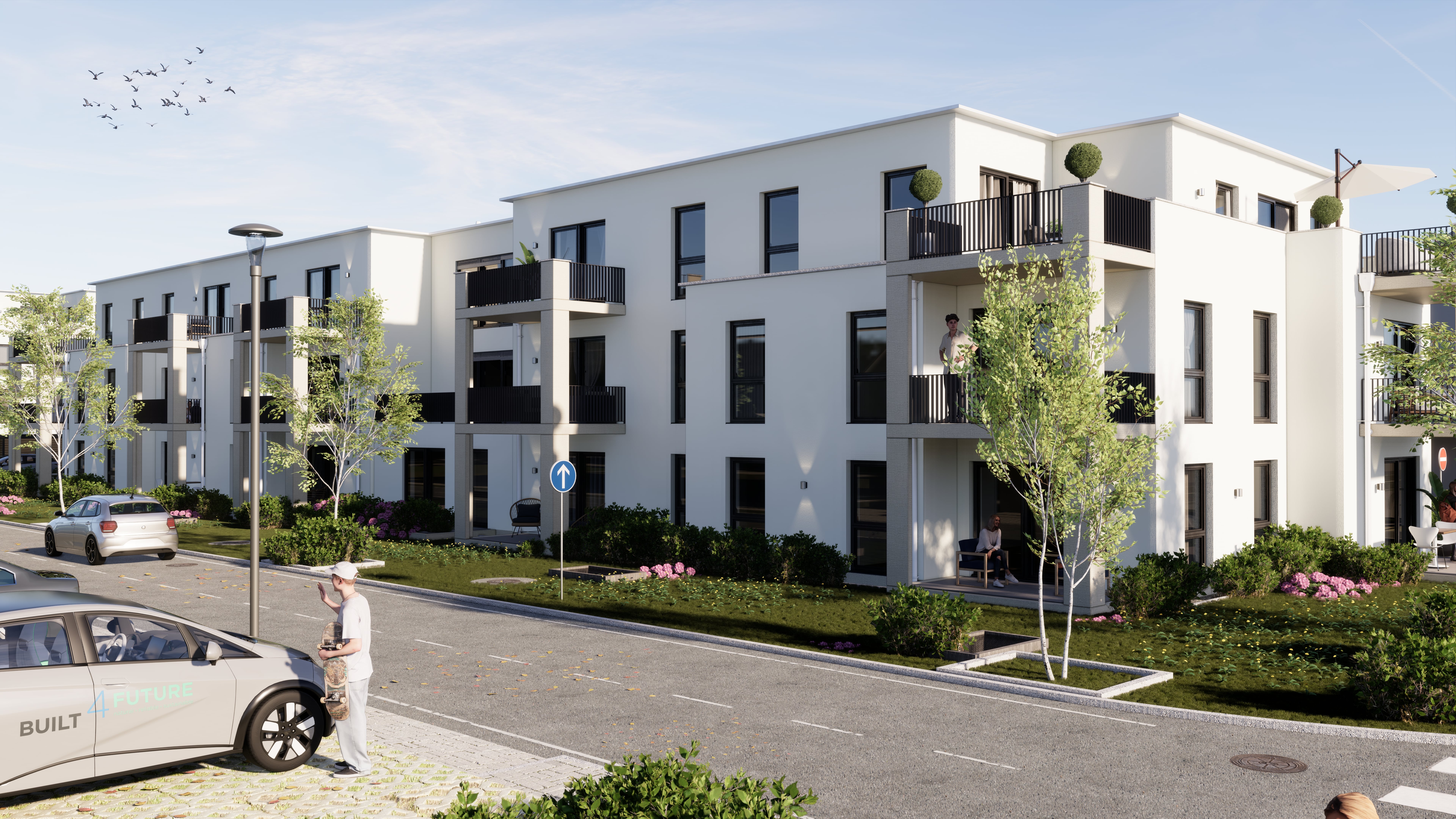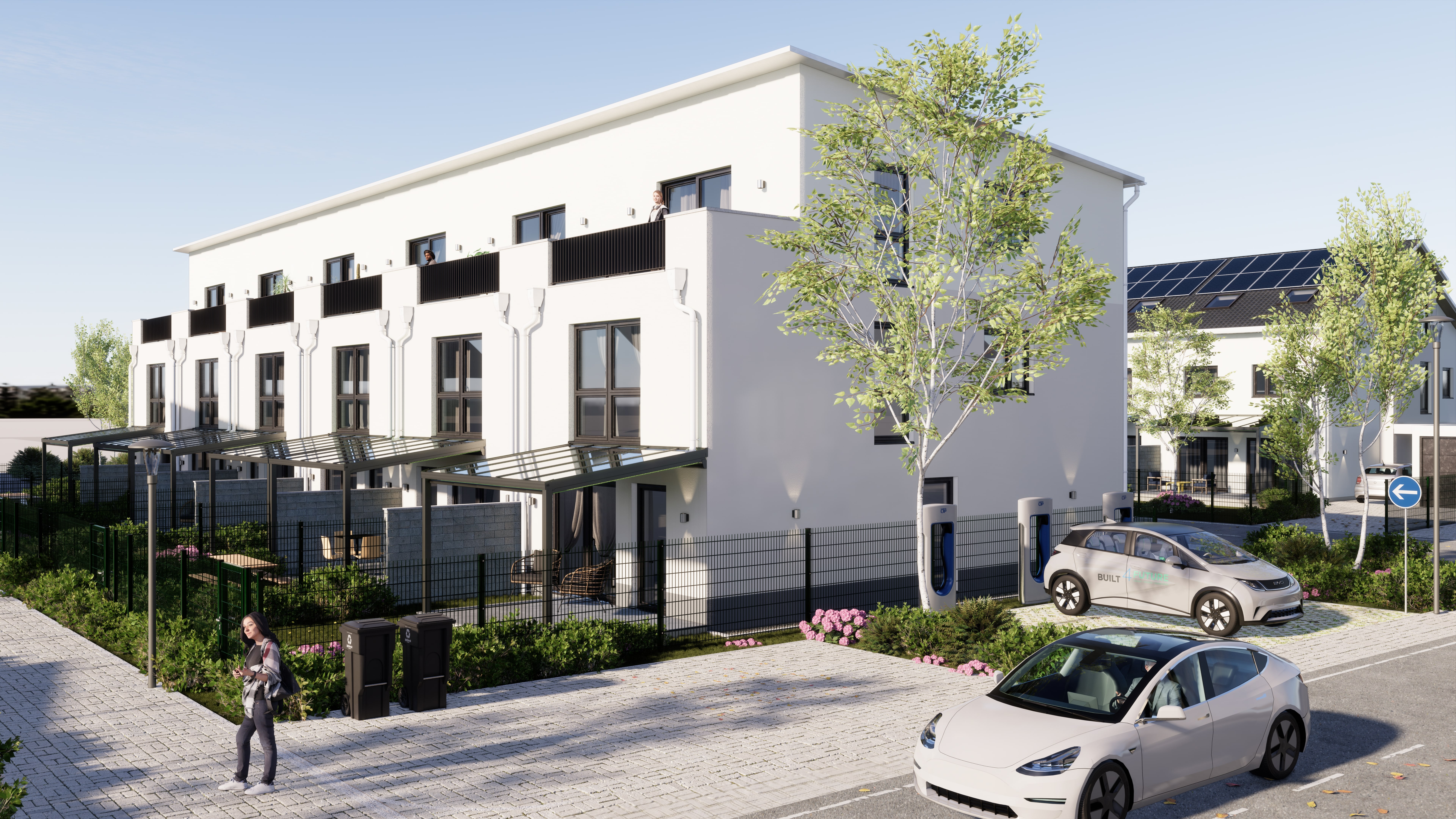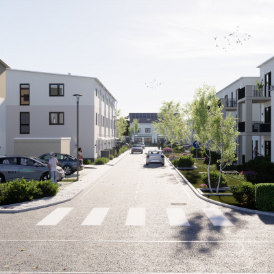 Das Quartier ist verkehrsberuhigt mit Parkmöglichkeiten zumeist in gemeinsamen Tiefgaragen mit vorbereiteter Ladeinfrastruktur. Auch ein Quartiersfahrzeug zur gemeinsamen Nutzung wird den Bewohnern zur Verfügung gestellt.