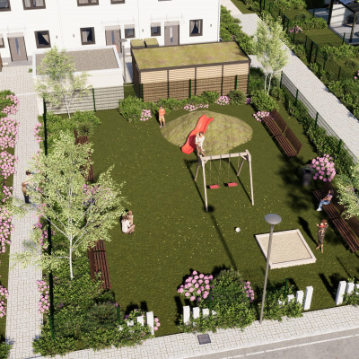 24 Reihenhäuser, 8 Doppelhaushälften und 3 Mehrfamilienhäuser mit insgesamt 86 Wohneinheiten.