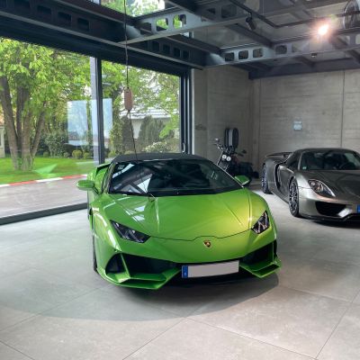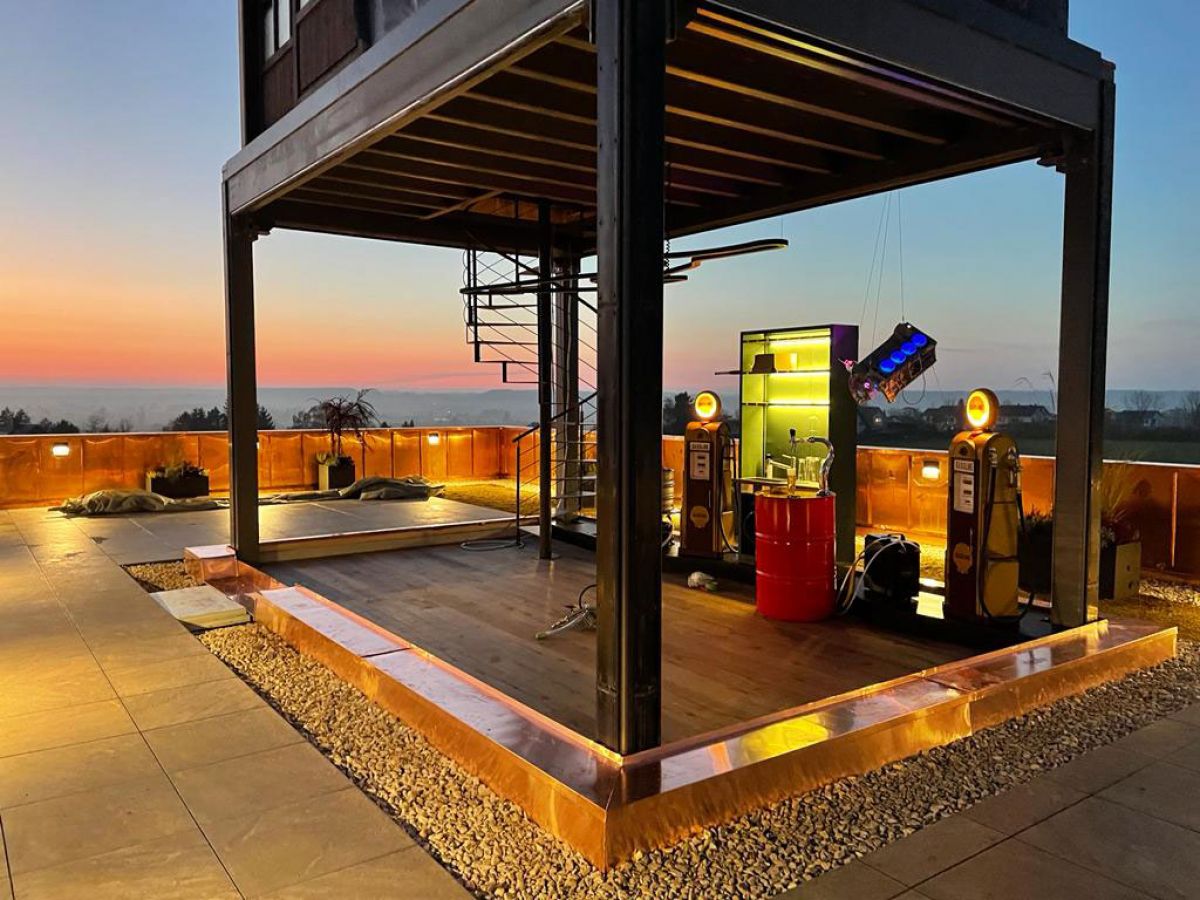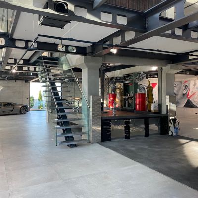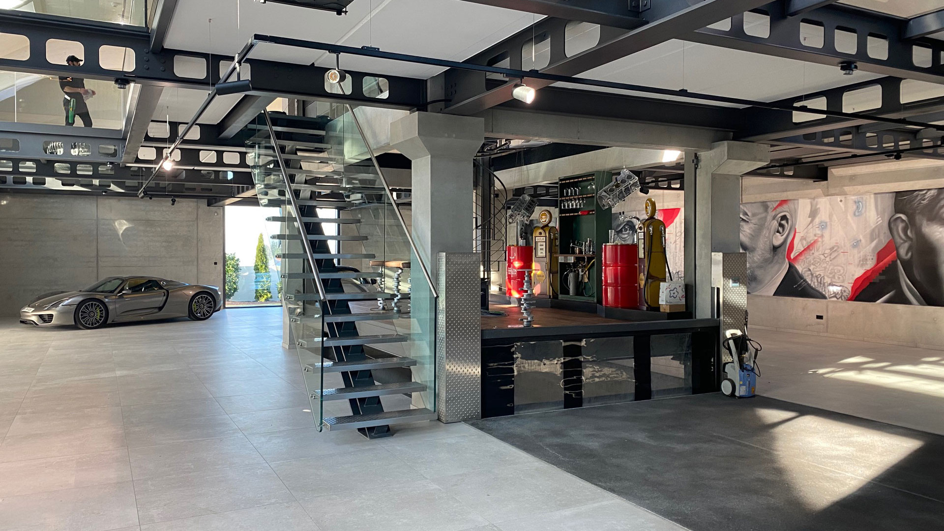 Im Untergeschoss befindet sich eine großzügige Werkstatt, in der die Fahrzeuge gepflegt werden. Das Dach ist mit einer großen Dachterrasse mit Weitblick ausgestattet. Der Aufzug, der alle vier Geschosse geschickt verbindet, ist gewissermaßen das Herzstück der Ausstellung und erstreckt sich ebenfalls über mehrere Stockwerke. Er enthält eine Motorsport-Bar, stilecht und detailverliebt mit Accessoires aus vergangenen Rennsportzeiten ausgestattet, und eine liebevoll eingerichtete Kuba-Lounge mit einladenden Ledersofas und dunklem Holzinterieur. Hier lässt sich in aller Ruhe und in guter Gesellschaft eine kubanische Zigarre genießen.