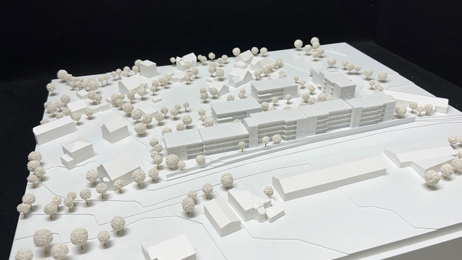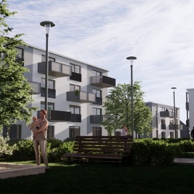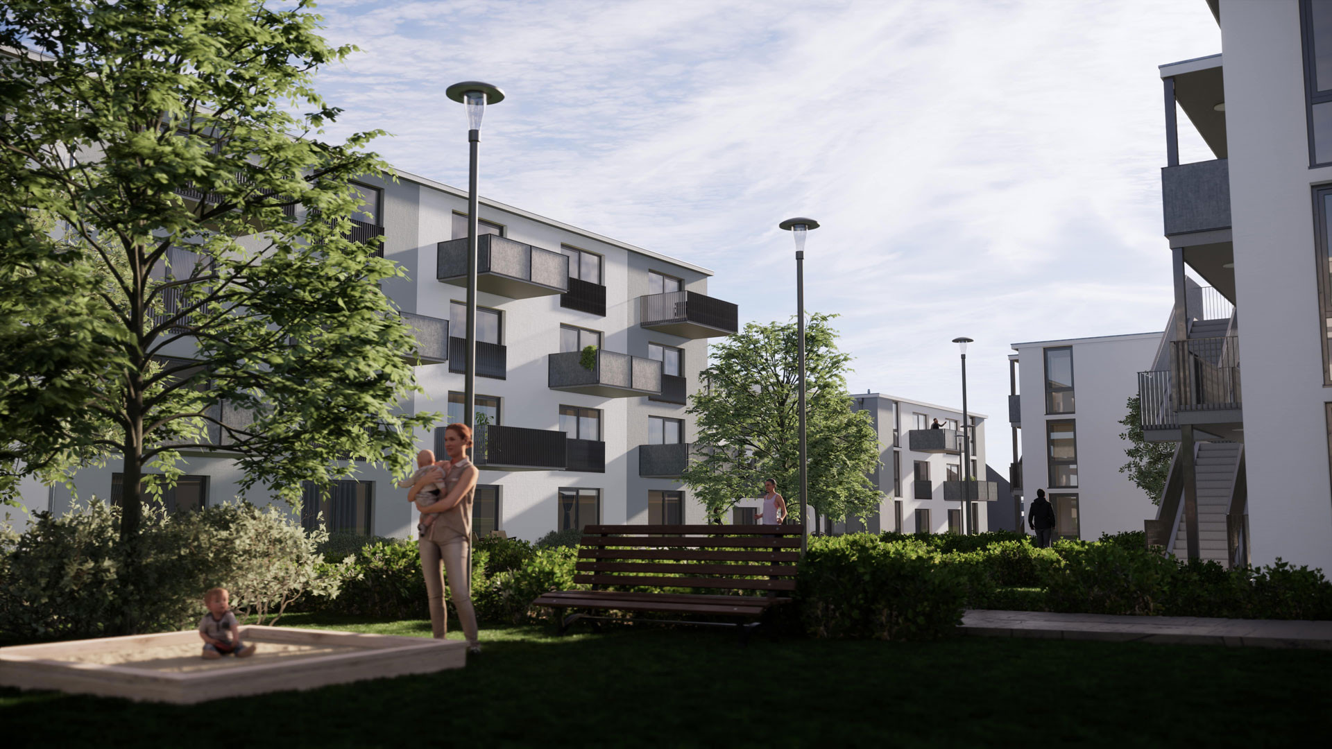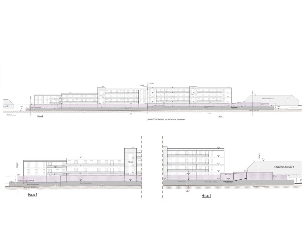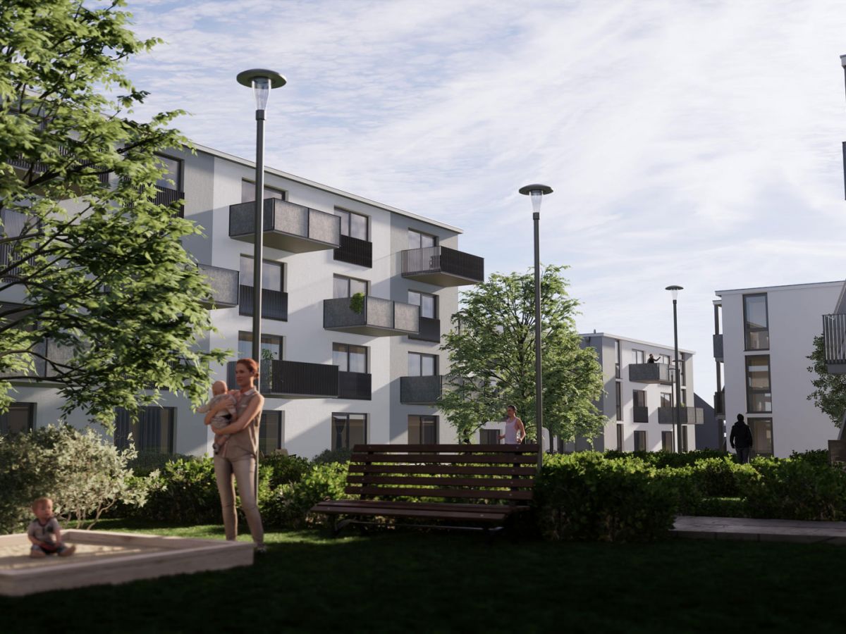 Durchdacht und umweltfreundlich: Die Gebäude an der Nordseite dienen als passiver Lärmschutzriegel, der die Wohnungen vor Lärm schützt und gleichzeitig einen friedlichen, grünen Innenbereich schafft. Jeder Baukörper erhebt sich elegant in 3 Geschossen, während die Riegelbebauung auf 4 Etagen für optimalen Schallschutz sorgt.