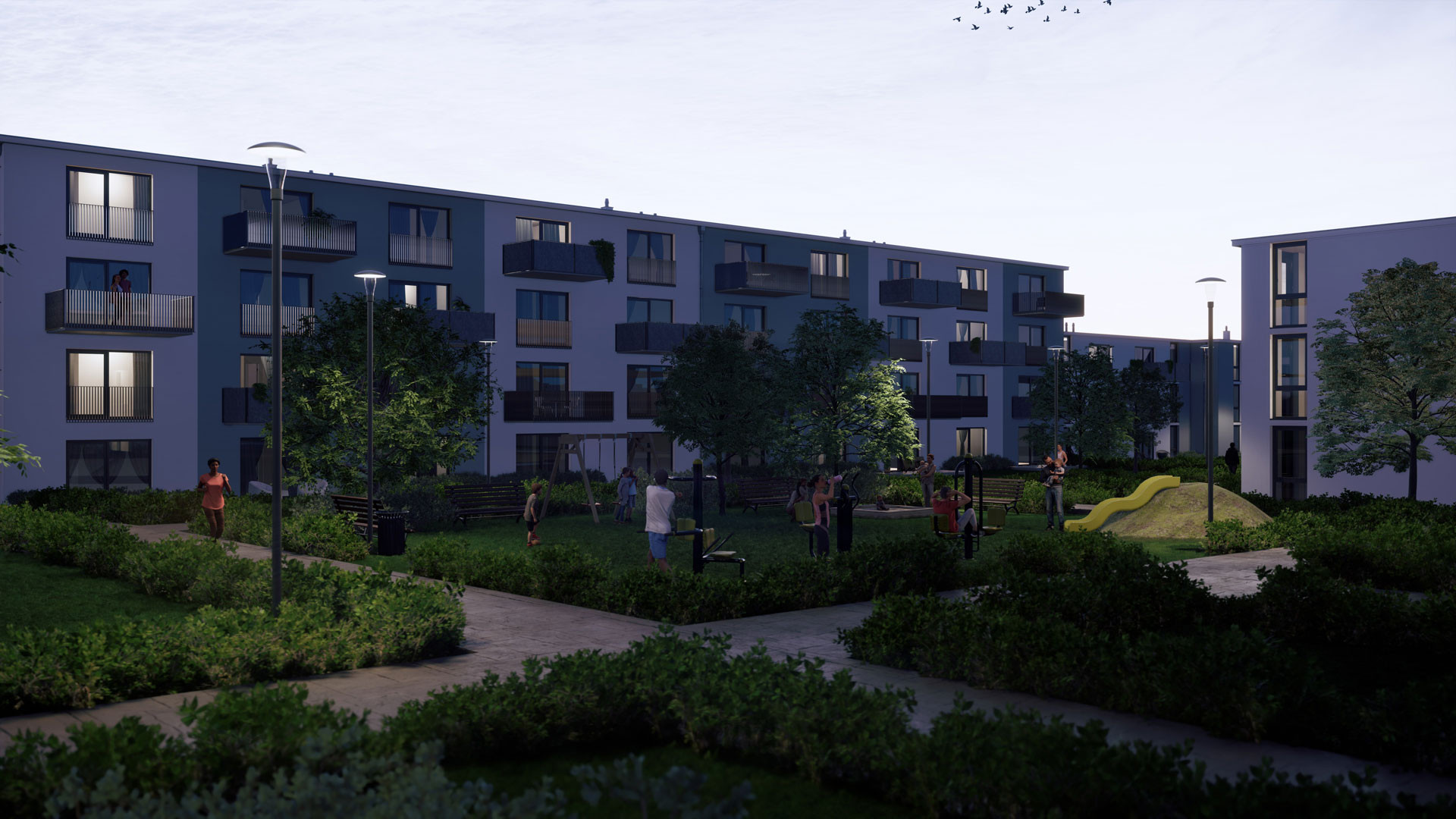 Das Zentrum der Anlage lebt mit ihren großzügigen Grünflächen, die von einem zentral gelegenen, fröhlichen Spielplatz gekrönt werden. Die inneren Erschließungswege verbinden harmonisch mit dem südlich gelegenen Fuß- und Radweg und laden zu entspannten Spaziergängen ein.